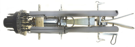 The flood guns are shown on the right. There are two heaters, cathodes, and anode gun assemblies mounted top and bottom onto the metal support which was fitted to the tube cone just in front of the main gun assembly. Electrons from the gun pass through the square aperture on the metal frame. The flood guns are arranged to