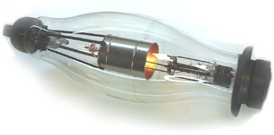 Kenotron: This large diode valve(45cm long)is generally known as a Kenotron. These were often used in x-ray power supplies but this particular one was for use in military radar during WWII. The part number is CV19 and it is capable of handling peak reverse voltages of 68kV. Shown here with the filament running on a 9V supply the actual heater voltage is quoted at 17V making it very bright. Although now replaced by silicon diodes, these valves can still prove to be more robust under stress conditions.
