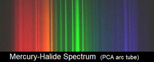 By adding halides to the mercury arc the colour-temperature and colour can be controlled. This can results in light output close in appearance to that of tungsten. Although still a line spectrum, the red, blue and green activity can be balanced to trick the eye. This technique is so versatile coloured flood lighting can also be produced.